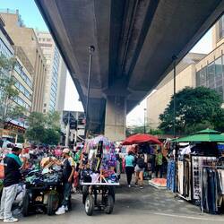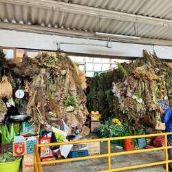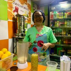 Das Zentrum erschlägt (im positiven Sinne) mit Reizen von allen Seiten. Straßenverkäufer mit Lautsprechern, Staturen von Botero, endlose Marktstände mit Schuhen, Kleidung, Kappen. Ich laufe im Menschenstrom, in der einen Hand eine frische Mango, die andere auf meiner Tasche. Es ist eine unübersichtliche aber gute Stimmung, ich fühle mich sicher und Teil vom wuseligem Leben in Medellín. In kleinen Cafés gibt es Ruhe und guten Kaffee, überall gibt es handgemachten Schmuck. Im geschäftigen Markt Placita de Floréz könnten die Eindrücke nicht vielseitiger sein: frisches Fleisch, von der Decke hängen ganze Schweine, frische Schnittblumen, Deko bis unters Dach gestapelt, unbekannte Früchte, duftende Kräuter. Ich trinke frischen Curubasaft bei Gloria. Wir sprechen alle Sprachen und lernen voneinander. Wir unterhalten uns über einheimische Früchte, das Leben in Kolumbien und Deutschland, ihre Familie - so eine herzliche Begegnung.