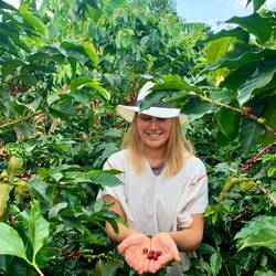 Wir besuchen die Kaffeeplantage von Rosas Familie und lernen über die Entwicklung des Landes, den Anbau und die Ernte. Im passenden Outfit schlängeln wir uns durch die Reihen des eng bepflanzten Berges, pflücken rote Bohnen und sind beeindruckt von der Effizienz der Profi Plücker*innen (in 8 Stunden 300kg Bohnen). Wir starten den Prozess der Verarbeitung unserer 1.5 kg schweren Ernte (dafür würden wir nur ein paar Cent bekommen). Nach der Auslese wird die Schale entfernt, die Bohnen 4 Tage fermentiert und für ca 1 Monat getrocknet. Für die Zubereitung des Kaffees werde ich mir merken und anwenden: Medium roast, 7 gr für 100ml und 3 min brühen.