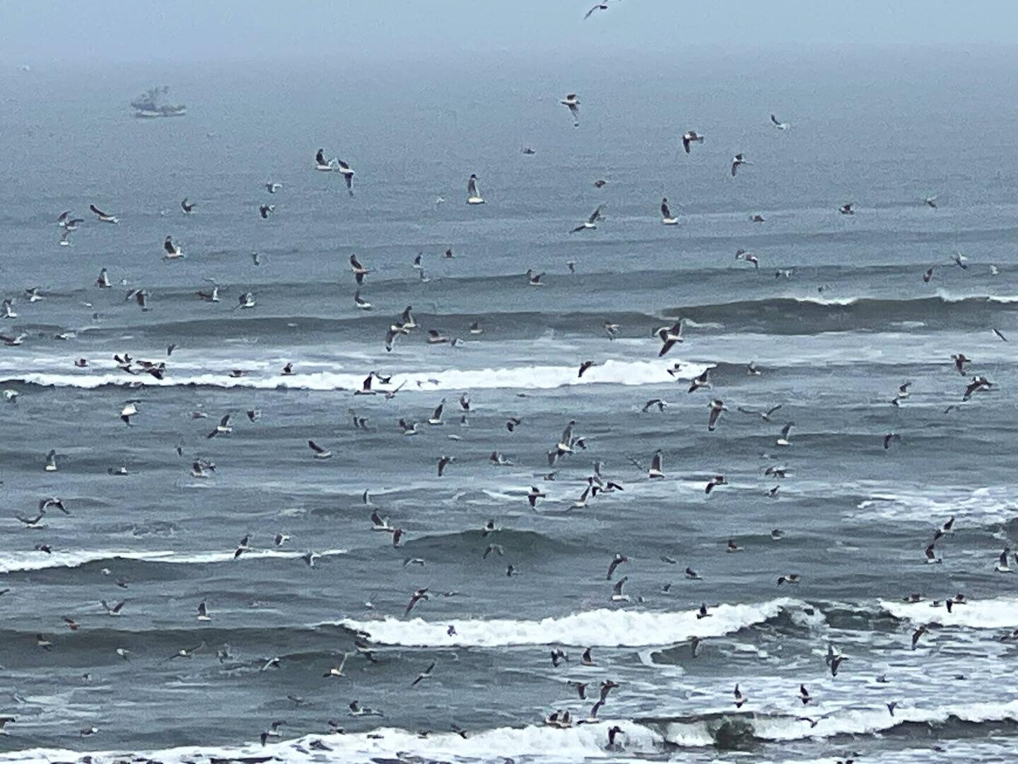Ein Morgen mit leichtem Nieselregen. Tausende von Vögeln aufgereiht am Strand, als ob sie dort meditierend auf den Sonnenaufgang warten.