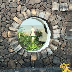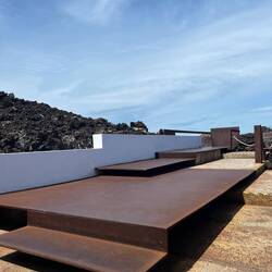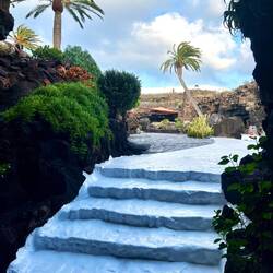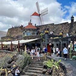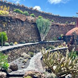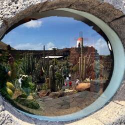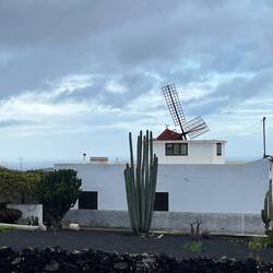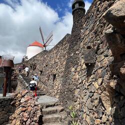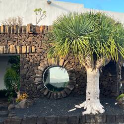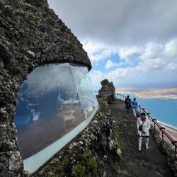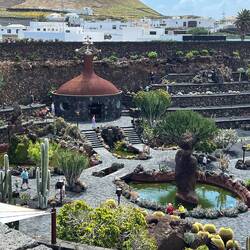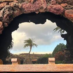 Nach einem frischen, selbst gepressten Orangensaft, an den wir uns sehr schnell gewöhnt haben, geht es los in den Norden der Insel. Aufgrund der überschaubaren Dimensionen der Inseln ist man in einer Stunde schon am Ziel. Der Norden ist gebirgiger. Erkennbar sind drei große, gut erhaltene Vulkankegel. Die Weinkultur mit den Kratern und Mauern sind hier kleinteiliger und in die steilen Berghänge eingegraben. Die Vegetation dazwischen ist üppiger, was auf eine fruchtbare Deckschicht schließen lässt. Auf einem der Hügel sehen wir einen erhabenen Landsitz, mit weitem Blick über die Weinberge, bis hin zum Meer. Kleine Dörfer reihen sich entlang der Straße- bis wir fast zum Ende der Insel kommen- eine hohe Kuppe, von Steinmauern gefasst, ist unser Zielpunkt, der berühmte Mirardor del Rio. Dies ist der schönste und berühmteste Aussichtspunkt auf der Insel, gekrönt und inszeniert von einem ikonischen Gebäude - von wem wohl? Natürlich von Cesar Manrique, der hier wieder mit genialem Händchen ein Meisterwerk geschaffen hat.