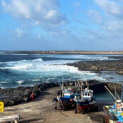 Wir haben ein Appartement in La Santa, ein ehemaliges Fischerdorf im Nordwesten. Direkt am kleinen Hafen und mit direktem Blick aufs Meer mit rauschender Wellenkulisse. 5 Wellenreiter versuchen mit mehr oder weniger Können die wilde Flut zu meistern.