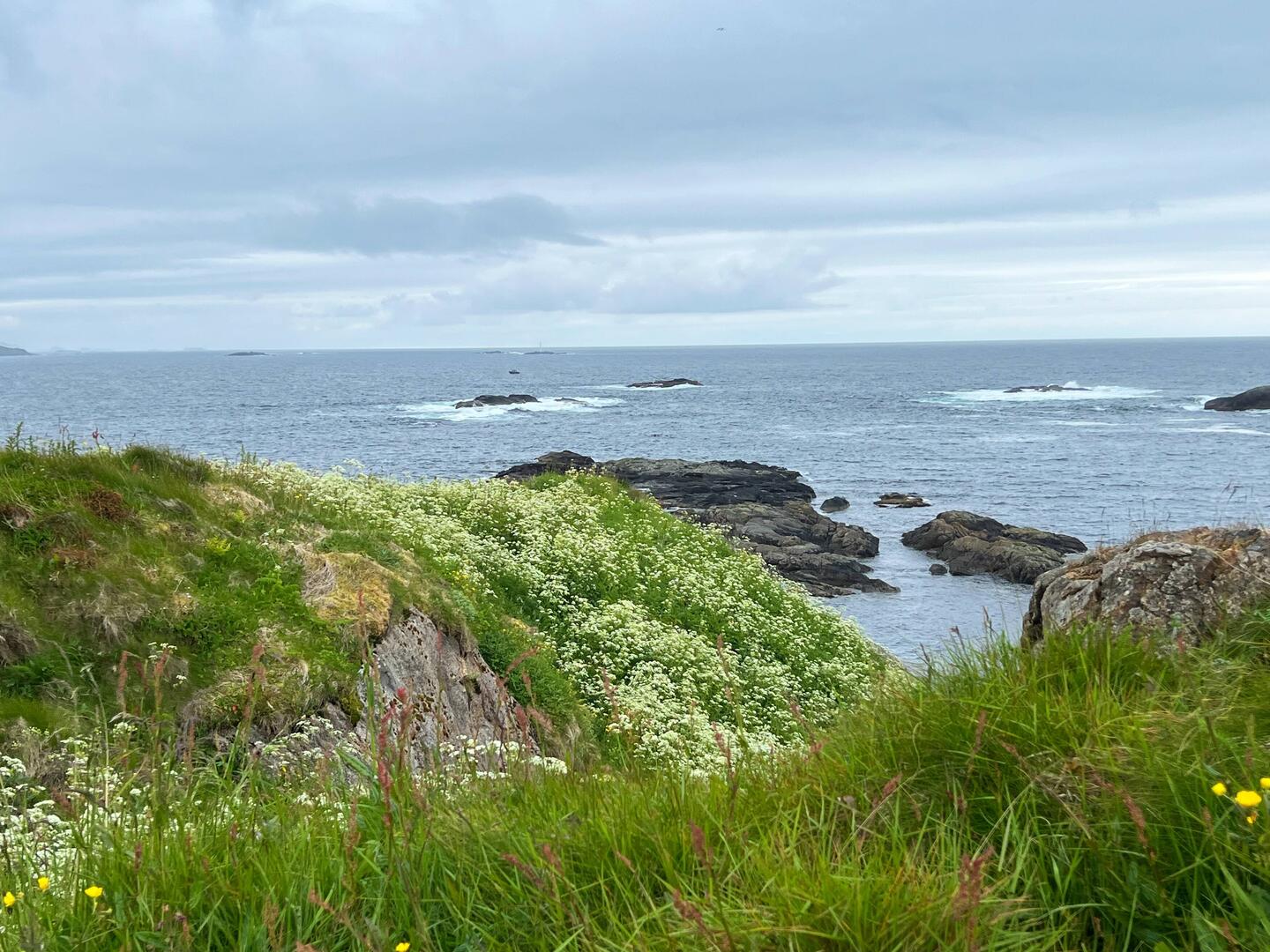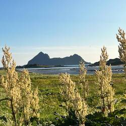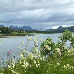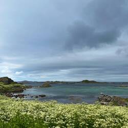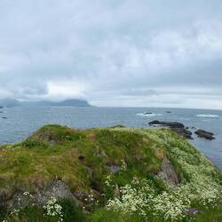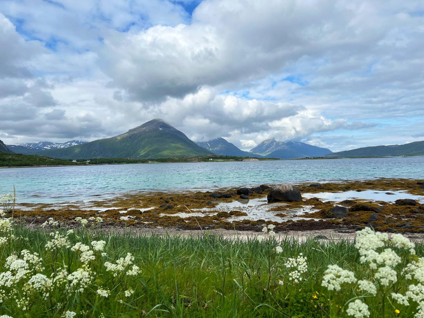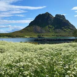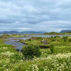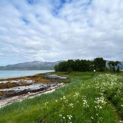 Trotz leicht bedecktem Wetter starten wir unseren Ausflug Richtung der Insel Oksnes. Wir fahren entlang des Ramsetfjorden durch eine intensiv grüne Landschaft.weite Blicke, gepflegte Grundstücke mit englischem Rasen inmitten einer blühenden Wiesenland- schaft. Am Ende der Straße ein kleiner Hafen und der Blick über die Fjorde mit hohen Bergen und Inseln die weiße Farbtupfer mit Häusern aufweisen. Der Strand ist übersäht mit Muschel und Schnecken, die hier niemand sammelt.