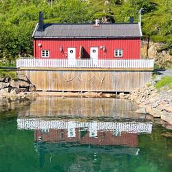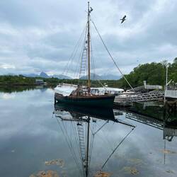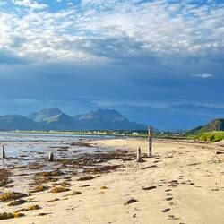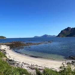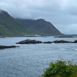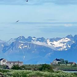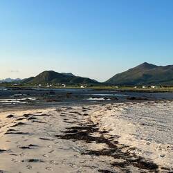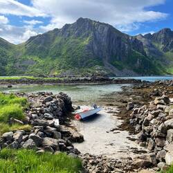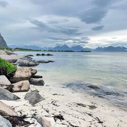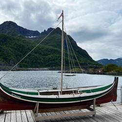 Wir haben ein wirklich spezielle Quartier in Boe an der Südspitze von Langoya. Wir haben ein Appartement in einer riesigen Bootshaus, in dem gerade ein altes Holzboot liegt. Das Bootshaus ist direkt am Strand mit einem spektakulären Blick auf eine riesige, von Bergen gegliederte Bucht. In der Ferne sehen wir die Kulisse der schroffen Bergspitzen der Lofoten.Read more