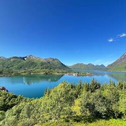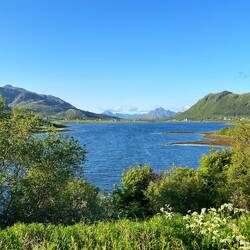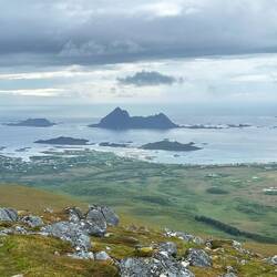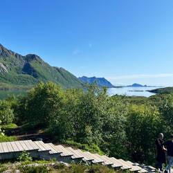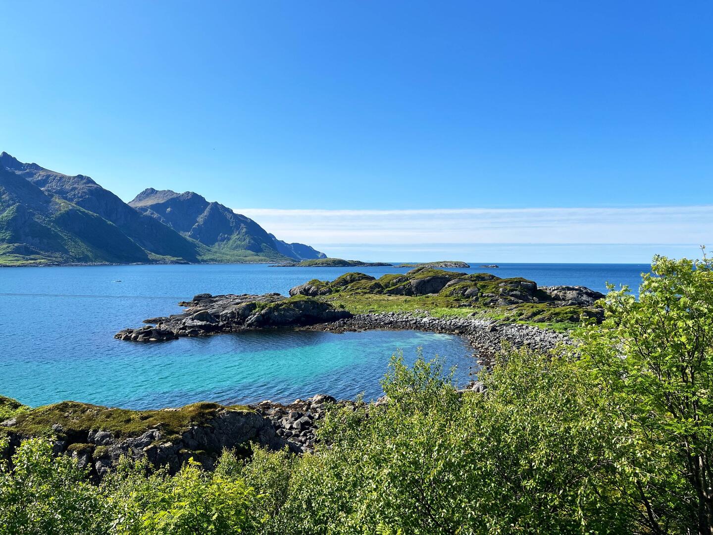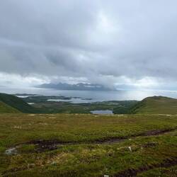 Je höher wir kommen , um so überwältigender werden die Ausblicke. Wir können im Oste und Westen die Buchten und Fjorde sehen und in der Ferne die angrenzenden Inseln sowie die Bergkette der Lofoten.