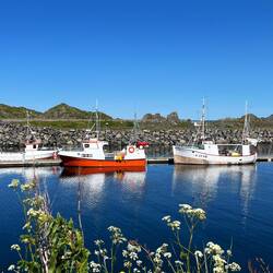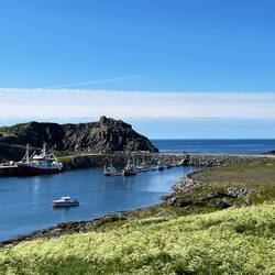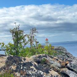 Am Ende der Insel im kleinen Ort Hovden ein Fischerhafen, mit Kai und Pier, ein Leuchtturm als Wegweiser. Die langgezogene Bucht von Bergen und Inseln gesäumt. Die kleinen rotweiss gefärbten Leuchttürme setzen sich auf den Inseln fort und bilden Blickpunkte an der Fahrtrinne der Boote.
