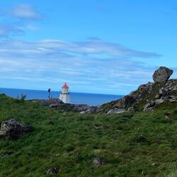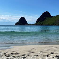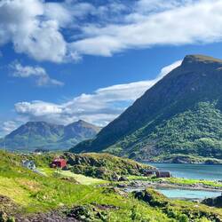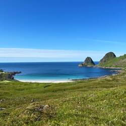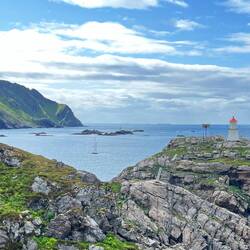 Bei traumhaft schönem Wetter sind wir die Küste entlang gefahren bis zum nördlichsten Punkt in Hovden. Eine schmale, meist einspurige, geschwungene Straße führt entlang der Küste. Auf der einen Seite das Meer, glitzernd, mit kleinen Inseln in der Ferne, auf der anderen Seite mächtige Bergrücken, teils grün, teils als schmale Spitzen, dramatische Blickpunkte und Landmarken.