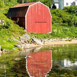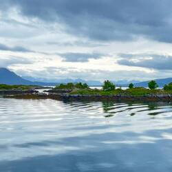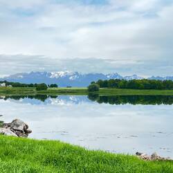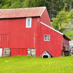 Heute war das Wetter bedeckt, mit einzelnem, temporärem Nieselregen - aber immer wieder mit trockenen windstillen Phasen. Wir sind entlang des Eidsfjorden gefahren. Ein schmale, geschwungene Straße direkt am Wasser. Grün, blau, Rot, Grün und Weiß waren bestimmende Farben. Das saftige Grün der Wälder und Berghänge, Blau in vielen Schattierungen des Fjords, Rot und Weiß sowie auch Blau die Häuser, Bootsschuppen und Scheunen. Immer wieder andere Bergkulissen sowie davorliegende Inseln.