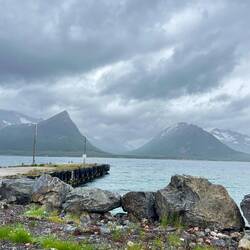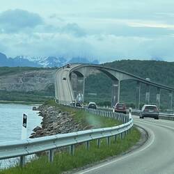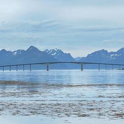 In Finnsness quert eine Brücke den Fjord an seiner engsten Stelle. Nach insgesamt ca. 2 1/2 Stunden sind wir auf der Insel Senja angekommen.
