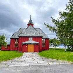 Am frühen Nachmittag machen wir einen kleinen Ausflug. Wir beginnen an einem historischen Handelshaus in Hemmestadt, direkt am Fjord. Dort wurde Fisch gegen alle wichtigen Handelsgegenstände getauscht. Leider hatte das Museum heute nicht auf. Danach ging es nach Trondenes, einem kleinen Ort oberhalb von Harstadt. Hier gibt es die größte Kirche von Nordnorwegen- finanziert durch die reichen Einkünfte des Fischfangs. Direkt angrenzend ist eine Gedänkstätte für gestorbene russische Kriegsgefangene. 100.000 davon kam auf die Vesteralen, rd. 15.000 sind hier gestorben und wurden an diesem zentralen Ort gemeinsam begraben. Die Kriegsgefangenen haben das Gräberfeld mit vielen Holzkreuzen selber errichtet. Inzwischen gibt es nur noch einen Gedenkstein mit Inschrift.