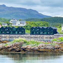 Zurück geht es über die Berge auf einer eng gewundenen Straße, vorbei an grünen Tälern mit zwei malerisch von Bergen (bis zu fast 1.100 m hoch) gerahmten Seen. An diesen finden wir die ‚Datschensiedlungen‘ der Norweger, stationäre Wohnwägen mit einem angrenzenden kleinen Funktionsgebäude. Sehr monoton und fantasielos. Ich denke die pragmatischen Norweger wissen, das dies ein gutes Fischrevier ist. Alles andere ist zweitrangig 😁.