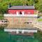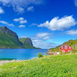 Nach kurzer Fahrt gelangen wir zu unserer neuen Unterkunft- eine wunderschöne, romantisch gelegene und eingerichtete rote Hütte direkt am Fjord.
