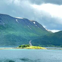 Beide Inseln, Rolla und Andorja sind relativ klein und bestehen aus riesigen, steilen Bergen von 900 m bis 1.200m. Vom Meeresspiegel aus betrachtet ist dies sehr beeindruckend. Die Straße verläuft auf der Ostseite, eingeschnitten, oder besser gesagt hineingesprengt in steil abfallende Berghänge. Das Wasser fällt teilweise als Sturzbach direkt an der Straße hinunter. Wie aufgrund dieser Rahmenbedingungen zu erwarten ist die Straße mehrheitlich einspurig und abenteuerlich geschwungen. Einziger Vorteil - die Straße ist eine Sackgasse, die an der Fähre endet. Entlädt die Fähre, dann bewegt sich eine Karawane an Fahrzeugen in eine Richtung…. Einziges Handicap sind mögliche Bauarbeiten. Wie zu erwarten war dies natürlich der Fall, da die ständig notwendigen Reparaturen und Ausbesserungsarbeiten nur in den Schnee- und frostfreien Sommermonaten erfolgen können ☹️. Dennoch ist die Strecke einzigartig hinsichtlich der vielfältigen Ausblicke über den Astafjorde und die beiden abgehenden Fjorde Gratangen und Lavangem. Dazu kommen die kleinen Ansiedlung, die entlang der Straße verteilt auftauchen… Die Frage, was die Menschen machen, oder von was sie leben (Fisch, Fisch , Fisch und etwas Landwirtschaft) hatten wir schon einmal.