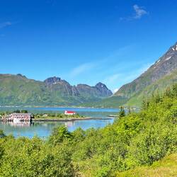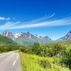 Durch fruchtbare Hochtäler mit einer Vielzahl an Bauernhöfen gelangen wir nach Sortland, wo wir über eine mächtige, leicht geschwungene Brücke den Sortlandfjord queren.