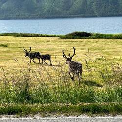 Beim Aussteigen sehen wir ein riesiges Rentier, das ruhig neben einem Haus liegt und genüsslich wiederkäut. Es beobachtet uns und unser Interesse gelassen, ohne sich stören zu lassen. Wir umrunden einen großen Teil der Bucht und treffen auf einzelne verlassene Häuser, bzw.. Höfe. Die wenigen Wiesen werden gemäht, um Heu für den langen Winter zu gewinnen. An den Häusern, selbst in den entlegensten Ecken fährt ein Rasenrobotter herum. Bei so viel Wildnis muss es um die Häuser ordentlich (amerikanisch) gepflegt aussehen. Das ist für uns oft befremdlich …