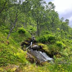 Auf dem Rückweg machen wir noch einen kleinen Abstecher zu einem wilden Flusslauf- dem Auslauf des größten Wasserfalls. Dort liegt auf einem Hügel im Wald eine Hütte für Wanderer. Dort treffen wir auf ein junges Pärchen, dass zu Fuß auf dem Weg zum Nordkap ist. Sie haben sich 3 Monate Auszeit genommen, um sich diesen Traum zu erfüllen…