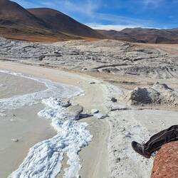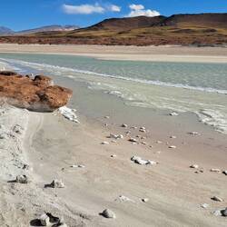 Die Piedras Rojas, die roten Steine, sind für uns leider nicht so toll. Die Wind rast hier nur so und wir haben alle nicht die richtigen Klamotten dabei. Deswegen rasen wir durch den weg hier. Alles für die Fotos! Trotzdem ist es schön, das Salz hier am Rande des Sees zu sehen. Manche bauen da an ruhigeren Tagen wohl sogar Salzmenschen draus 😁