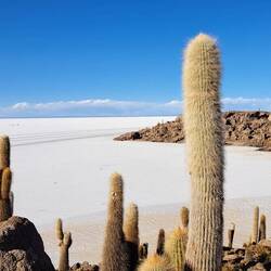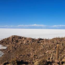 Unser letzter Touristopp ist eine der Inseln der Wüste. Bewachsen von riesigen Kakteen ragt sie aus dem Weiß heraus. Die Kakteen hier wachsen ca 1 cm pro Jahr. Und die höchste ist knapp 12 Meter hoch. Wer gerne rechnen will😉