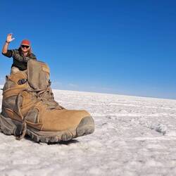 Nach einer kleinen Shoppingtour und einem leckeren Mittagessen geht's dann richtig in die weiße Endlosigkeit. Um uns herum ist alles weiß. Am Horizont erkennt man noch die Berge und Vulkane. Und dann wird vor uns das Dakar Denkmal immer größer. Von 2013 bis 2016 fand hier in der Salzwüste das wohl bekannteste Wüstenrennen statt. Für uns aber viel interessanter: die Bilder, die man hier machen kann. Also legen sich die Fotografen auf den Boden und spielen mit der Perspektive. Die Ergebnisse sehen sehr cool aus.