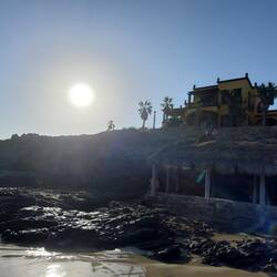 El tema de hoy es traje de baño de flores. En Playa Cerrito. Otra playa recomendada en la via a Todos Santos. Es como una colonia de Surfeadores, las olas son ajitadas, pero es una playa bañable. Dan clases surf. Allí tomamos el sol, nos bañamos en la.playita y modelé mi regalo de cumpleaños, el pareo o salida de baño. También caminamos por la.playa y vimos en la punta de la playa una imponente hacienda que se asoma en el risco.Read more