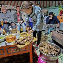 Vorbei an Jurten und Pferdefriedhöfen geht es auf neu ausgebauten asphaltierten Straßen bis Bajanchondor. Wir essen in einer Jurte sehr schmackhaftes Rindfleisch -Read more