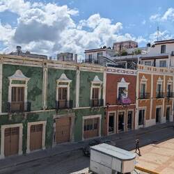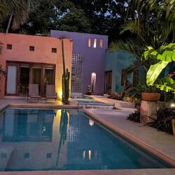 Bus to merida. We got in late afternoon, and took a taxi to our Airbnb, which is very cute and has a pool. As is our habit, we unpacked and then headed out to find groceries. We walked blocks throughLæs mere