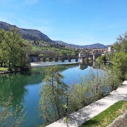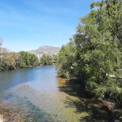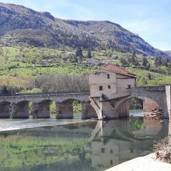 Unser Campingplatz liegt etwas außerhalb, so wandern wir am Fluss entlang bis zur alten Brücke mit dem Mühlenhaus. Sehr anstrengend bei der Hitze.