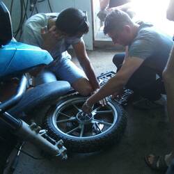 An der nächsten Tankstelle prüft Karl den Reifendruck und wir reden noch drüber, wie gut Blue bis jetzt durchgehalten hat. Nach vielleicht 60 km fangen Geräusche an, die nichts Gutes verheißen. Karl bleibt bei einer Feldwegsausfahrt stehen, um sich das anzusehen. Er vermutet, dass die Geräusche entweder vom Gabelkopf oder vom Vorderradlager kommen. Er versucht alle relevanten Schrauben nachzuziehen, aber schon nach kurzer Fahrt stellt sich heraus, dass das Radlager kaputt ist und dass es nicht mehr lange weitergehen kann. Wie gut, dass wir kurz darauf ein Geschäft für Landmaschinen sehen. Die Leute können natürlich genauso wenig deutsch wie wir russisch. Karl deutet mit einer kreisenden Bewegung auf das Radlager und macht kchkchkch und die Verkäufer verstehen das Problem sofort. Sie können uns auch nicht helfen, sondern schicken uns zu einem Automechaniker abseits der Straße. Die Werkstatt schaut total verschmuftelt aus. In einer Box wird gerade ein Auto gewaschen und nebenan ist ein kleinerer Raum mit einer Wuchtmaschine, einem Werkzeugschrank, einer Couch und einem Tisch. Ein junger Mann kommt heraus und schaut sich den Schaden nach dem "kchkchkch" einmal an und schüttelt den Kopf. Danach läuft er lange telefonierend im Hof herum, schaut sich einen Lada innen und außen an und es scheint, als hätte er uns schon wieder vergessen. Wir haben uns sowieso schon längst damit abgefunden hier für eine Weile festzustecken. Karl macht dann mal eine fragende Geste in seine Richtung, von wo dann ungefähr so eine Bewegung kommt wie: nur mit der Ruhe, es kommt eh Jemand! Tatsächlich tauchen hintereinander sechs Burschen auf. Der letzte von Ihnen stellt sich als Alexander vor und ruft dann seine Schwester an, die englisch kann. Über das laut gestellte Telefon wird dann gedolmetscht. Es stellt sich heraus, dass sie das Vorderrad herunternehmen und das Radlager ausbauen wollen, um zu sehen, welches Modell das ist. Dann müsste das Teil im etwa 200 km entfernten Wolgograd bestellt und irgendwie hierher gebracht werden. Sie rechnen mit etwa drei Tagen und sagen, sie wüssten auch eine Unterkunft für uns. Wir nehmen also unser Gepäck ab. Die Sechs nehmen ganz einfach unsere Blue hoch und tragen sie über einen hohen Türstaffel in die Werkstatt. Dort wird sie wieder Richtung Tür gedreht und hinten aufgebockt, damit sie nicht umfallen kann. Dann kommen zwei dicke alte Reifen unter den Motorblock um das Vorderrad freizubekommen, das dann ausgebaut wird. Zwischendurch verschwindet wieder einer von ihnen mit dem Auto und kommt mit einem anderen Satz Werkzeug zurück. Danach wird auf ganz einfache Weise das Radlager herausgenommen und einer von den Jungs sagt: Ah, Magazin! Und wieder verschwinden ein paar für ein paar Minuten. In der Zwischenzeit macht uns Alexander Kaffee und zeigt uns ganz stolz seine Motorräder, eine Yamaha und eine Honda, auf dem Handy. Die Burschen kommen mit einem passenden Radlager zurück! Innerhalb kürzester Zeit ist unser Motorrad wieder zusammengebaut und wird wieder in den Hof hinausgetragen. Wir können unser Glück kaum fassen! Von unserer Ankunft hier bis jetzt hat das bloß eineinhalb Stunden gedauert! Wir sind überglücklich und wollen bezahlen. Aber nichts da, sie wollen einfach nichts nehmen, kein Geld, nichts, nicht einmal den serbischen Zwetschkenschnaps. Sie gaben zum Ausdruck, dass das eine Aktion unter Benzinbrüdern sei und dass es ihnen Spaß gemacht hat, uns zu helfen. Es folgen viele brüderliche Umarmungen und ein Abschiedsfoto und mit nochmaligem Dank der endgültige Abschied. Wir können noch gar nicht fassen, was wir gerade erlebt haben. Ganz beseelt von unserem Glück fahren wir weiter und kommen bald darauf wiedermal zu einer einspurigen Baustelle. Vor der roten Ampel wartet schon eine lange Reihe von Lastwagen. Und wie das eigentlich überall mit dem Motorrad so üblich ist, fahren wir an der LKW-Schlange vorbei bis zur Ampel. Wenn etwas entgegen kommt, hat man normalerweise immer noch genügend Platz um auszuweichen. Das erste Auto, das uns begegnet ist ein Polizeiauto und wir sind auf der verkehrten Seite der Sperrlinie!!! Wir sind kaum bei der Ampel, haben die umgedreht und stehen mit aufgedrehtem Folgetonhorn und blitzenden Lichtern schon wieder neben uns! Karl muss ins Polizeiauto einsteigen. Pfff, jetzt wird's amtlich! Es sind zwei Polizisten im Auto. Einer holt sein weises Buch hervor und erklärt ihm auf englisch, dass das Überfahren einer Sperrlinie 4 Monate Führerscheinentzug zur Folge haben würde. Man könnte aber auch eine entsprechende Strafe zahlen. Und er sagt Karl, er solle mit den Fahrzeugpapieren zum Motorrad gehen und mit einem 5000er (69 €) im Zulassungsschein die Papiere wieder zurück bringen. Was wir auch gern gemacht haben. Dann wurden wir wieder freundlich entlassen. Diesmal kriegt der Kollege auch was ab. 5000 ist durch zwei ja auch viel besser teilbar als 1000 durch vier, oder?