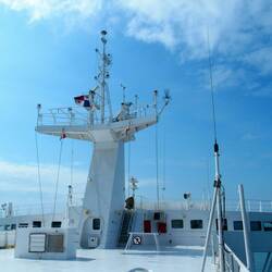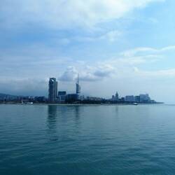 Morgens müssen wir um 1/2 8 Uhr zum Einchecken im Hafen, und um 8 Uhr bei der Fähre sein, die um 12 h ablegen soll. Um 1/2 11 stehen wir noch immer vor dem Schiff. Dann müssen wir uns wieder bei einem Containerbüro anstellen und zum x-ten Mal Pässe, Tickets, Zulassungsschein und Führerschein vorzeigen, das wird nochmal alles in den PC eingegeben. Beim Einfahren ins Schiff alles nochmal und außerdem die KFZ Versicherung für Georgien! Hallo? Wir verlassen das Land gerade! Man zeigt uns nur noch, wo wir die Maschine hinstellen und mit was wir sie fixieren können. Auf den meisten Fähren macht das das Personal. Hier nicht, die stehen nur rum und schauen ob's gemacht wird. Um dreiviertel Zwölf sind wir endlich in unserer Kabine und schon wieder duschreif. Auf den Cardecks der Fähren ist es immer unangenehm heiß und stickig. Bei der Rezeption gibt es einen Wasserspender und das ist das Einzige was man auf dieser ukrainischen Fähre jetzt zu trinken bekommt. Alle Bars, Shops und das Restaurant öffnen erst nach dem Auslaufen aus dem Hafen. Wann das ist? Das weiß man nicht! Um 1/2 3 gibt's eine Durchsage wegen des Mittagessens und natürlich strömt alles hin. Wir sind für den 5er Tisch eingeteilt. Die Tische sind schon alle fertiggedeckt. Es gibt Suppe, gebratene Hendlhaxen mit Nudeln und Salat und Saft. Jedem das Gleiche, ohne Diskussion, fertig. Das gilt auch für Frühstück und Abendessen. Das Restaurant öffnet um 8 h, 13 h und 18 h 30 jeweils für eine halbe Stunde und bitte kommen Sie nicht zu spät! Das haben wir noch nie erlebt!
