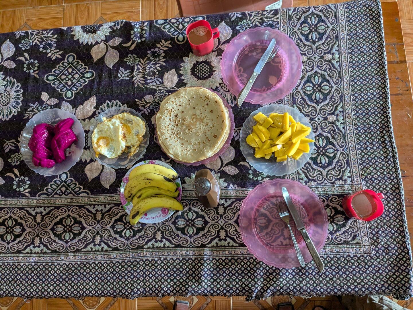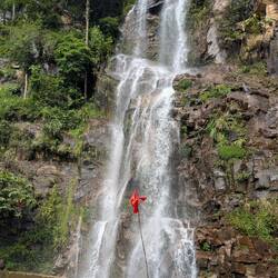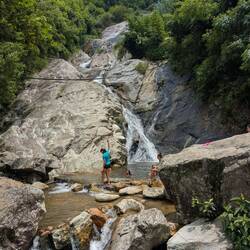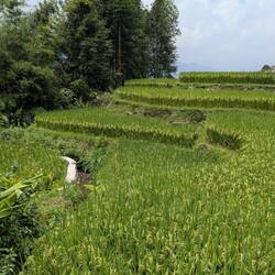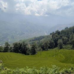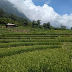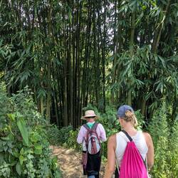 Die Nacht bei Mama Chi war sehr erholsam und morgens gab es ein tolles Frühstück. Dann sind wir mit Mama Chis Mann durch Bambuswalder, über Reisfelder, andere Dörfer und über einen Staudamm bis zu einem Wasserfall gewandert.