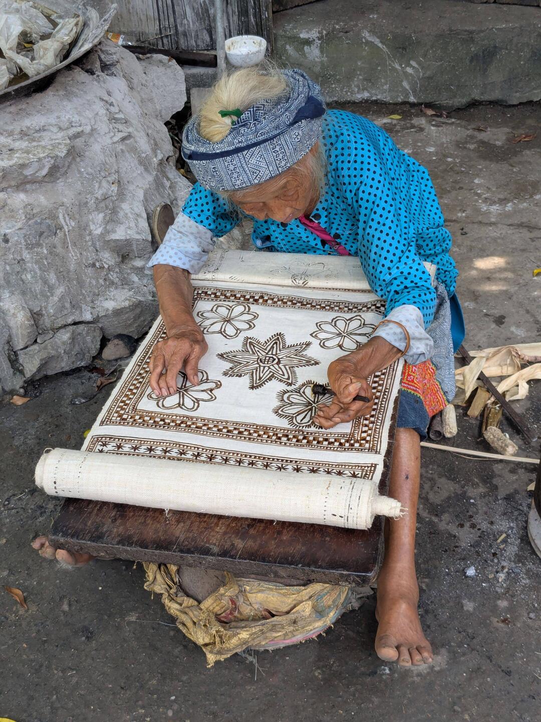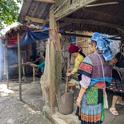 In einem etwas größeren Dorf haben wir einen Stop gemacht und uns wurde die Stoffproduktion aus Hanf gezeigt. Die alte Frau ist fast 100 Jahre alt und arbeitet als Stofffärberin schon fast genauso lange.
