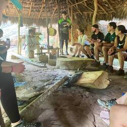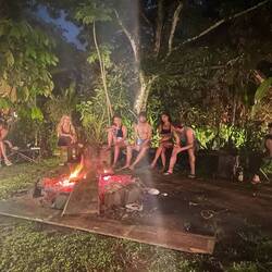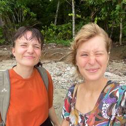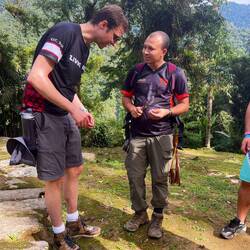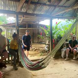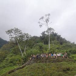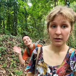 Andi und Melissa hätte ich nicht besser beschreiben können. Oleg hat mich sehr zum Nachdenken gebracht. Besonders am vorletzten Tag hat er mich gefragt, ob er meine Meinung hören könnte: “ I think the others are picking on me. What do you think?” Eine sehr direkte Frage… die anderen haben ihn nur noch “Machete” genannt, weil er sich am ersten Tag eine gekauft hatte und damit durch den Dschungel fuchtelte (I Need to practice my skills). Einmal bin ich auch davon gelaufen, weil ich Angst hatte beim nächsten gefallen Bambus fällt mir ne Schlange auf den Kopf 😅 selbst die guides Sprachen untereinander über ihn und auch im anderen Gruppen kannte man schon das “pollo loco” (verrücktes Huhn). Aber ohne Oleg wäre der Trip auch nur halb so schön gewesen, da er so viel reden konnte und so einen anderen Blick auf die Dinge hatte. Während Wilson (der altere der beiden Guides) bspw den Vortrag in der Ciudad Perdidad hielt, lief Oleg herum und beschaute sich fasziniert die Käfer, säbelte mit seiner Machete und rieb sich mit Daumen und Zeigefinger geschäftig das Kinn. Zurück zu seiner Frage, ich war ganz unvorbereitet darauf und konnte es natürlich voll verstehen. Danach war ich ganz nachdenklich und hab ihn jedes Mal zu uns an den Tisch geholt. Denn unser irisches Paar (Sharon und Andre) waren schon ein wenig genervt… mit den beiden bin ich immer die Berge hoch. André ist sehr ehrgeizig und wollte immer erster oben sein, weil dann die Pausen länger sind. Sharon konnte eigentlich viel besser schritt halten, aber das haben Sharon und ich für uns behalten :D Also schritten wir zügig die Hügel hoch und machten Tiergeräusche nach. André wurden irgendwann auch nur noch Gato (Kater) von Mono (der andere jüngere Guide) genannt. Tomke und ich waren übrigens Tortugas. Weil das ein Satz aus Duolingo ist und ich das mal zu Mono sagte : Tu eres una Tortuga (du bist eine Schildkröte). Aus Spaß. In der zweiten Nacht, also tomke und ich so viel lachen mussten und ganz vorne lagen. Davor mussten wir nämlich unsere Betten wechseln und ich darüber genervt war. Die neuen Betten waren aber halt eigentlich viel cooler und ganz vorne.