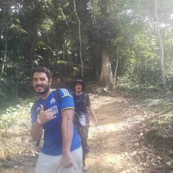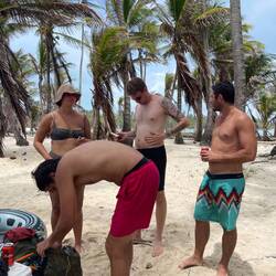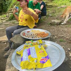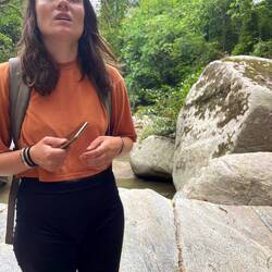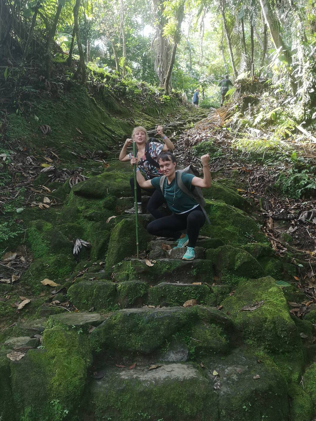 Der Tag war so voll mit Eindrücken, wie die Tage davor auch. Das frohe Aufstehen, das zusammen sammeln der klammen Sachen, schnell noch frühstücken mit Allen irgendwie, Zähne putzen und wieder die Wanderschuhe an. Da steht Mono auch schon seit circa 10 Minuten wartend herum und nennt uns mal wieder Peresosos🦥. Der Franzose (Thibaut- ach ne Chivo was auf spanisch Ziegenbock heißt haha) ist der Grund, warum alle warten müssen :D. Doch der erste Teil geht einfach schon los und da ich ja die Wanderstreberin bin, sind André, Sharon und ich schon unterwegs mit Mono. Es geht am Fluss entlang, über Brücken über die nur drei bzw. zwei Personen gleichzeitig laufen dürfen, vorbei an Wasserfällen und einem alten vom Unwetter zerstörten Camp zur verlorenen Stadt hinauf. Danach wieder zum alten Camp um erneut wieder viel zu viel an gutem Essen zu bekommen. Und von dort ging’s ins letzte Camp. Wieder ziemlich viel hoch und ansonsten kolumbianische Strecke (was so viel wie hoch und runter im Wechsel bedeutet) um dann im letzten Camp endlich entspannten zu können. Da waren wir auch alle gegen Abend richtig albern und ausgelassen. So ausgelassen, das Mono Tomke einmal die Musikbox abgenommen hat 😂 weil sie den nächsten Tag erklären wollten, aber tomke Musik angemacht hatte. Es wurden wieder viele Scherze gemacht. Anscheine hatte Mono auch erzählt, dass wir am letzten Tag alle zusammen zum Strand fahren und Tomke war fest davon ausgegangen, wie sie mir gerade im Bus erzählt hat hahaha.