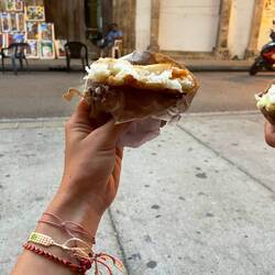Arepas.. Frittierte Maisdinger mit Käse drin. Nach belieben auch mit Butter oder Würstchen. Gibts hier überall, morgens mit Ei und später auf der Strasse mit allen möglichen Füllungen. Lecker lecker. Viel leckerer war jedoch das Ei, das mit Kartoffelbrei umhüllt wurde und frittiert. Ich wüsste gerne, wie der oder die Kreatorin dieser Leckerei auf die Idee gekommen ist, aber ich fands super. Abends gabs noch frittierte Kochbanane mit Gemüse und Käse lecker lecker lecker