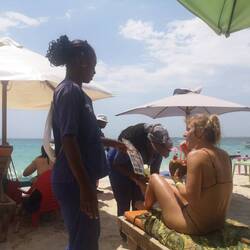 Auf einer Liege mit Seeblick lagen wir dann. Jede ne Kokosnuss in der Hand. Da gings uns wieder gut! Es kamen nur alle 2 Minuten Personen vorbei, die uns Kettchen, Essen, Sonnenbrillen oder Austern verkaufen wollten. Promoción promoción! Dabei waren die Leute super aufdringlich.. Einer hat Laura die Kettchen einfach auf die Füße gelegt. Dann kamen vier Frauen. 2 davon haben einfach jeweils einen Fuß massiert. Und immer wieder wiederholt, dass Laura sehr müde, muy cansada wäre. Dass man merken würde, dass sie viel arbeitet. Seit 2 Monaten besonders viel, würde ich mal sagen. Aber wir sind trotzdem schwach geworden. Lagen da auf den Liegen am Strand, Kokosnuss neben uns und jeweils eine Frau, die uns den Rücken massiert hat.
