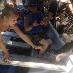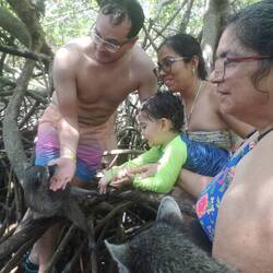 Wieder an Board ging es dann in so nen Miniausläufer von nem Mangrovenwald. Dazu meinte der Guide, dass Kolumbien nach Brasilien die meiste Biodiversität hätte. Im Mangrovenwald gibt's auch besonders viel Biodiversität, wie zum Beispiel Waschbären. Die kann man dann auch Füttern und auf den Arm nehmen. Erstmal haben wir das Spektakel nur kopfschüttelnd mit angesehen. Wie die ganzen Speedboats sich aneinander vorbei drücken. Und die Latinos ungelenkig auf die toten Mangrovenäste klettern um die Waschbären zu füttern. Dann irgendwann haben wir mitgemacht. Wir konnten ja eh nix mehr anders machen. Und Waschbären sind ja schon ziemlich niedlich.