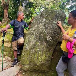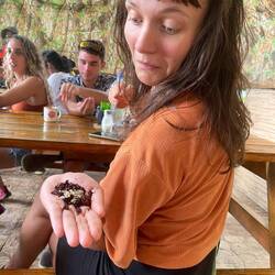 Wen gab es es, das kolumbianische Paar, die etwas alter waren als der Rest und zurückhaltend aber super freundlich waren. Und natürlich unsere Guides. Der eine war für die seguridad zuständig, hat dabei aber nichts anbrennen lassen. Schließlich sei er ja seit vier Monaten Single, wie er mir direkt am ersten Tag erzählt hat. Dann musste ich mich immer Tomatita hermosa nennen lassen und zum Glück hab ich das meiste nicht verstanden, weil der kein Englisch gesprochen hat 😅 Und Mono (eigentlich José ), dem David nichts mehr glaubt, weil er immer gescherzt hat, dabei aber so ernst blieb, das man ganz verwirrt war :D immerhin durfte ich am letzten Tag mit ihm auf dem Motorrad wieder zurück fahren, anstatt im Auto. Dabei haben wir einen richtig großen Papagei 🦜 gesehen. Dann gab es noch Eli, die Übersetzerin, die super viel erzählt hat, von Stein Pyramiden unter der Vegetation und die Tyronas (indigene Bevölkerung) ihre Töchter zum Schamanen für 2 Monate schicken, wenn sie ihre Tage bekommen, damit sie sexuell vorbereitet werden. Immerhin den Mann können sie sich danach selbst aussuchen … Schwere Kost und Diskussionsstoff am letzten Abend, aber inwiefern sind wir dazu in der Lage darüber zu urteilen ….