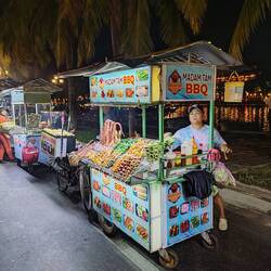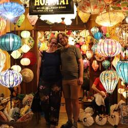 Tegen de avond gaan we op de fiets naar old town, ofwel het historisch centrum. De stad was eeuwenlang een belangrijke havenstad in de specerijen handel. Het oude centrum ligt aan de Thu Bon rivier, waarlangs vele markt en etenskraampjes hun waren verkopen. Nu het donker is geworden is het een drukte van belang. Tientallen bootjes met toeristen dobberen op het water om drijvende kaarsen te water te laten.