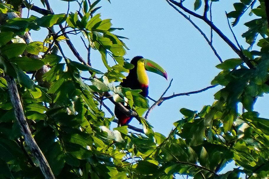 We gaan om 6 uur op pad met een kano en gids, een Amerikaan en een Duitse zitten voorin. We registreren ons eerst bij het kantoor van het park en varen dan door de brede kanalen van het park op zoek naar dieren. De dag begint goed met een toekan die in een boomtop zit.