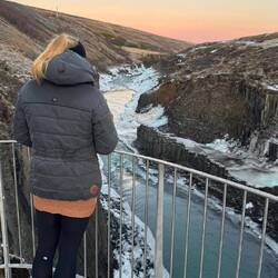 Ein riesiger Wasserfall. Der Weg dorthin war spannend. Man musste bis zur Aussichtsplattform einen Weg runter, doch dieser war sehr vereist. Mit Schlittschuhen hätte es besser funktioniert 😅