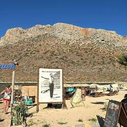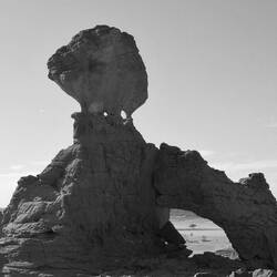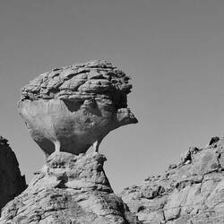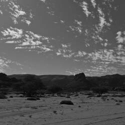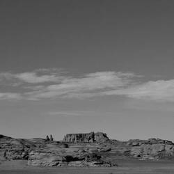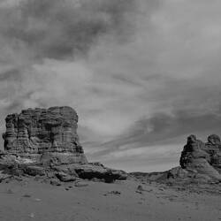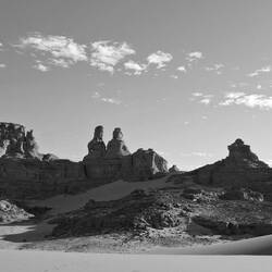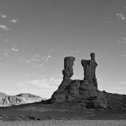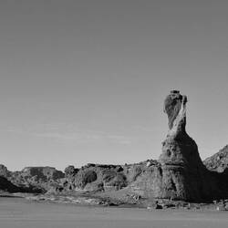 Mittwoch. Aufwachen in Tatrat. Schlecht geschlafen, da das Zelt auf schiefem Untergrund stand. Über der leicht gesellten sandigen Fläche, wo alle ihr Nachträge fanden, eine Felsformation, die König und Königin genannt wird. Die Landschaft hatte trotz der aufkommenden Sonne, dem Sandstein oder dem blauen Himmel nichts Mediterranes mehr, nichts Griechisches, Süditalienisches, Kretisches oder Zypriotisches. Zwischen den Bergen gab es weite dürrr Sand- oder Geröllflächen, die Szenerie und der weite Himmel erinnerten an Western von John Ford. Das unterbelichtete Schwarz-Weiß suggerierte die Nacht im Vollmond.