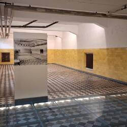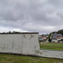 Ich lese in der SZ davon, dass sie in Flossenbürg eine Stimmen- und Bilderinstallation in Anbetracht dessen aufgebaut haben, dass die Zeitzeugen der nationalsozialistischen Terrorherrschaft wegsterben. Also fahre ich nach Flossenbürg in die Oberpfalz. Das Gelände in einem Talkessel überrascht vor allem durch die Einfamilienhaussiedlung, die man in den 50ern auf einem Teil des Geländes des Konzentrationslagers errichtet hat. Sie blickt auf einen bis auf zwei langgestreckte Häuser brachen Platz, der bis in die 70er und 80er einfach Parkplatz für LKW war. Auf einer Grasfläche die Grundmauern der Baracken. Fast abgebrochen hinter einer weißen Mauer das Haus der Folterungen und Ermordungen. In einem dahinter liegenden noch tiefer gelegenen Tal dann das Krematorium. Durch eine Rinne wurden die Toten dorthin auf kleinen Waggons gekarrt oder einfach heruntergeworfen. Baderäume, ein Steinbecken, Asche- und Restehaufen, darüber eine Kirche.