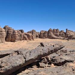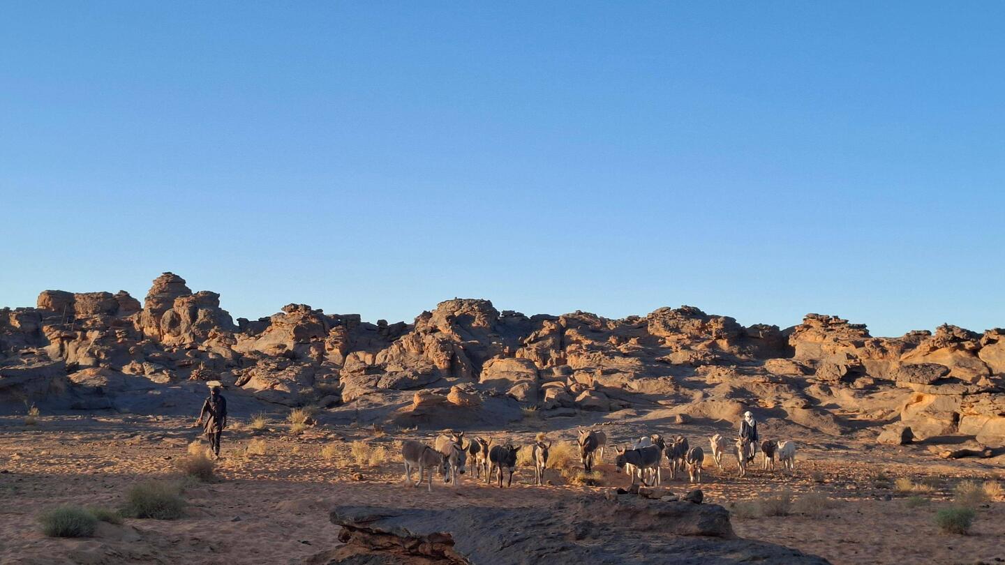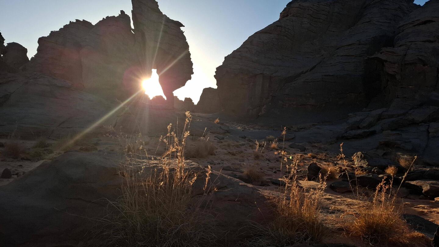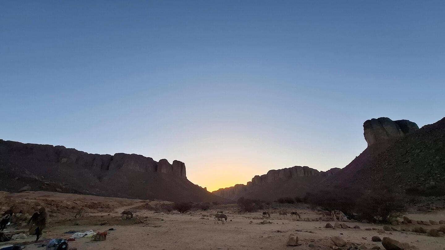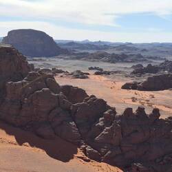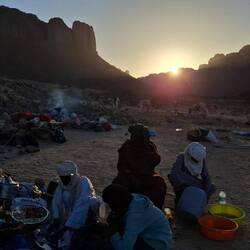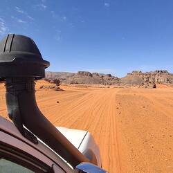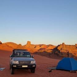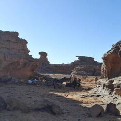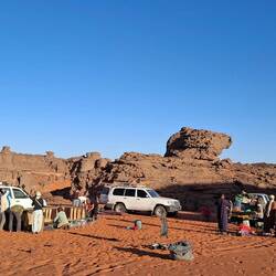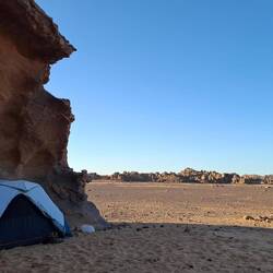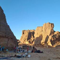 Nach dem Frühstück werden die Sachen gepackt und auf die Begleitfahrzeuge verteilt. Während des Besuchs des kleinen, aber informativen Tassili-NP-Museums in der Palmenoase Djanet, werden die letzten Behörden-Gänge durch Ihre Tuareg-Begleitmannschaft erledigt und letzte Einkäufe getätigt. Anschließend erfolgt die Fahrt in die nahgelegenen Ausläufer des Tassi N´Ajjer ("Plateau der Flüsse") bis zum Nachtplatz am Fuße des Akba Tafaloulet, von wo aus am nächsten Morgen der Aufstieg erfolgt. Die Region des Nationalparks Tassili N‘Ajjer (Weltkultur- und Weltnaturerbe) ist weltweit bekannt.