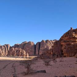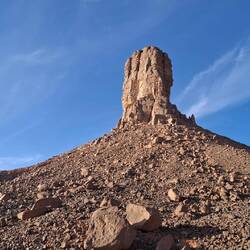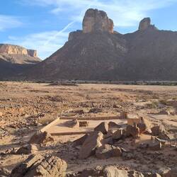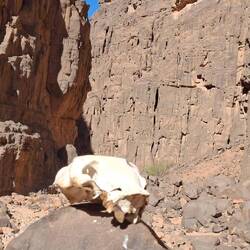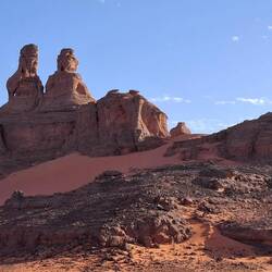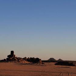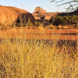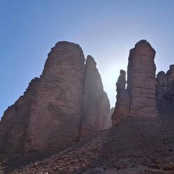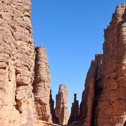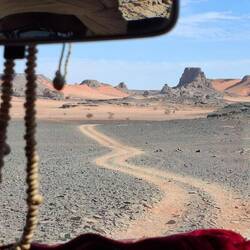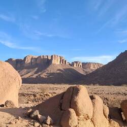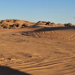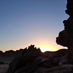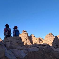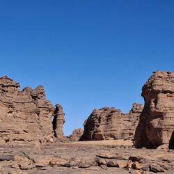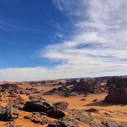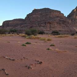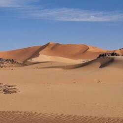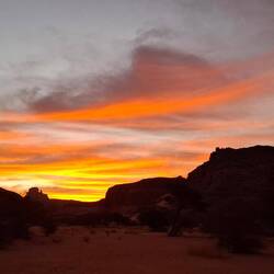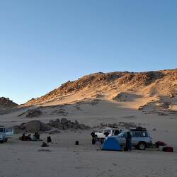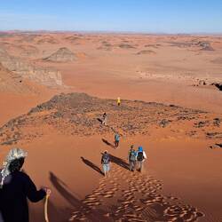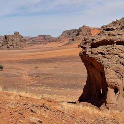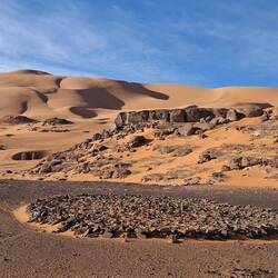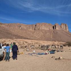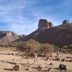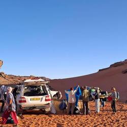 Nach einem letzten kurzen Abstieg verabschieden Sie sich von den Eseln und ihrer Begleitmannschaft. Das Gepäck wird in die Autos verladen und nach einem Mittagessen fahren Sie teils auf guten Asphaltstraßen, teils auf Pisten in Richtung Tadrart-Gebirge, südöstlich von Djanet gelegen. Die erste, wanderintensive, ereignisreiche Woche liegt hinter Ihnen. Das Nachtlager errichten Sie heute bei Oued El Berdj, ein ausgetrocknetes