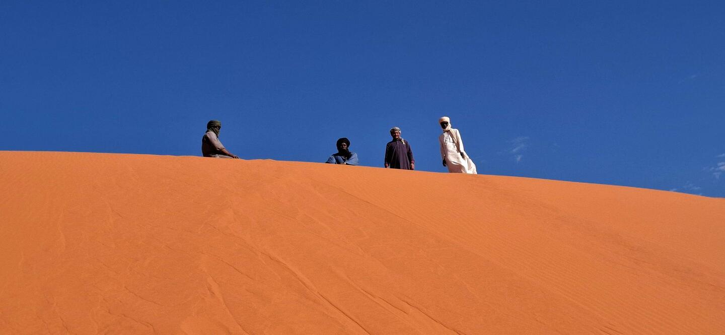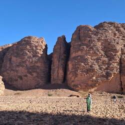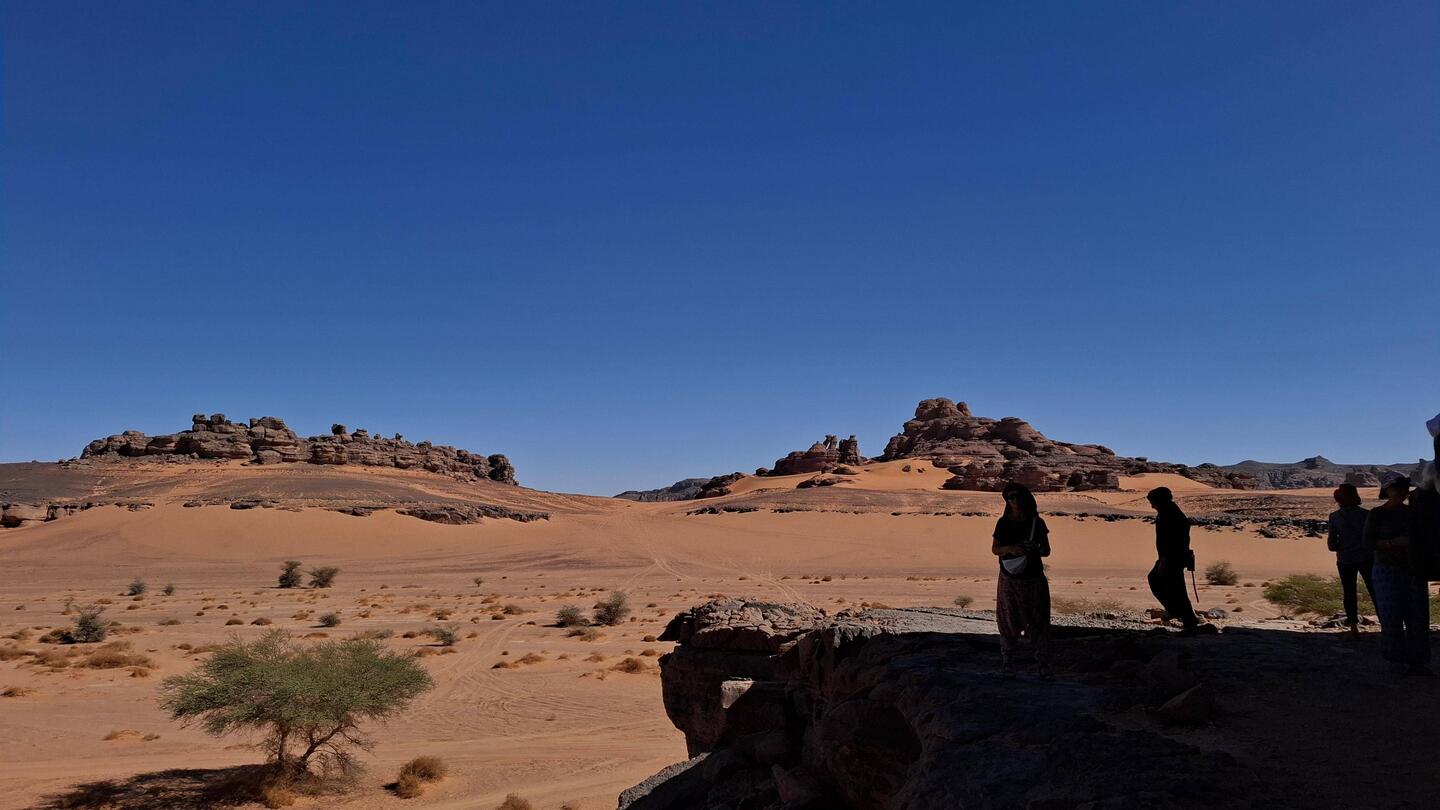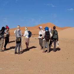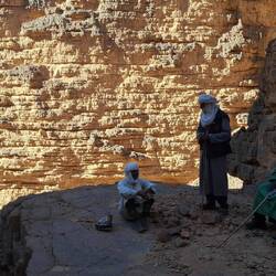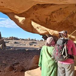 Sie laufen direkt nach dem Frühstück los, folgen erst dem Tal bis zur Zeichnung der „Dame mit Spiegel“ und erklimmen dann die erste hohe Düne. Von hier aus geht es durch eine wunderschöne Landschaft mal bergauf, mal bergab bis Jean Claud (Tifalgag). Es gibt weitere Gravuren und Zeichnungen zu bewundern bevor Sie die verdiente Mittagspause