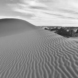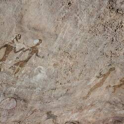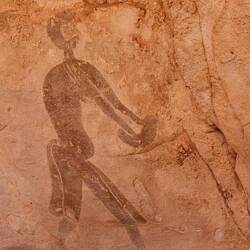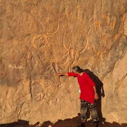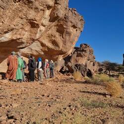 Nach dem Frühstück wandern Sie auf Dünen und im Wadi In Djaren über den ausgetrockneten See von In Djaren bis zu einem Antennengrab und werden dann von den Geländewagen abgeholt. Weiter geht es zur nächsten, eindrücklichen Felsgravur: „Kuh mit Band am Hals“, welche von der Domestizierung der Tiere in der Wüste zeugt. Nach dem