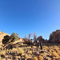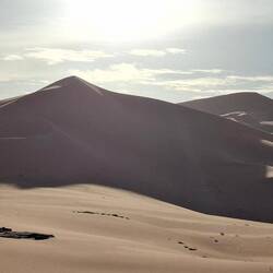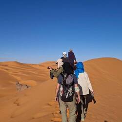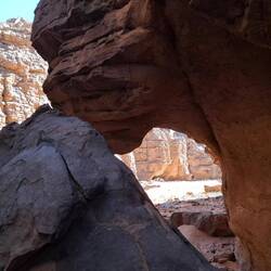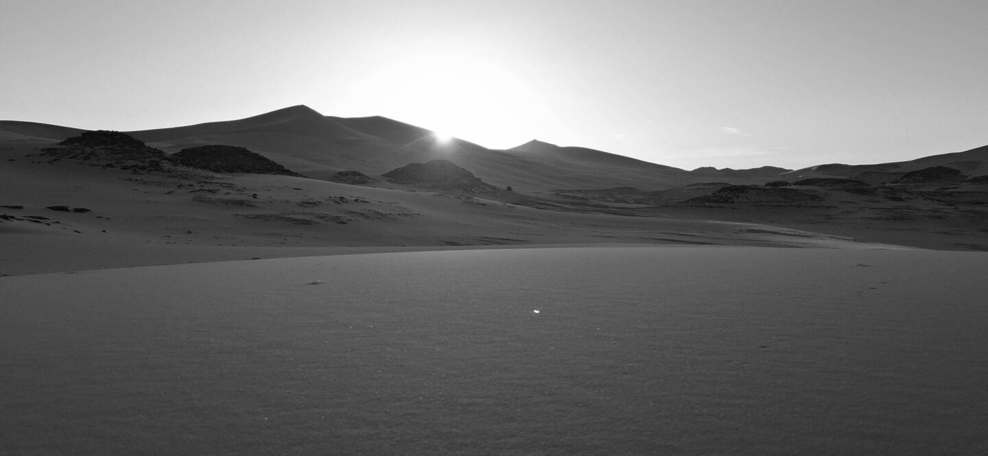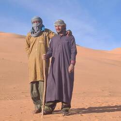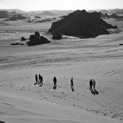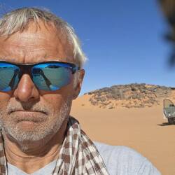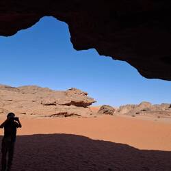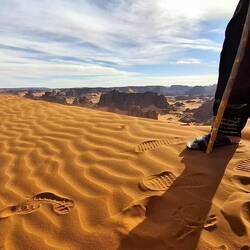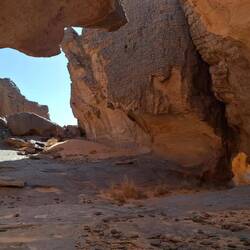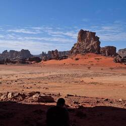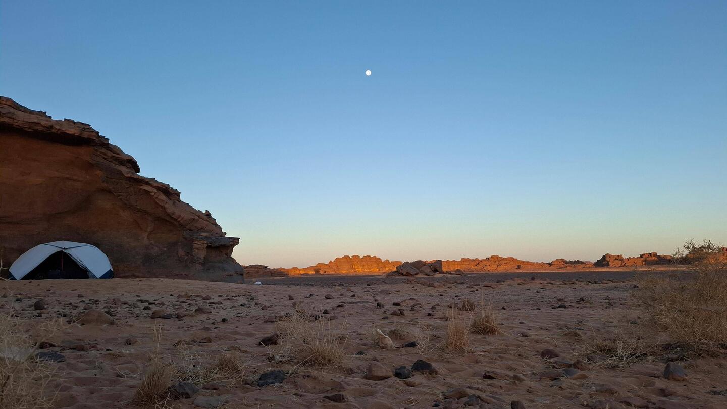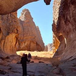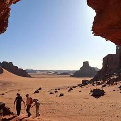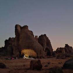 Alle Übernachtubgsplätze sind weiträumig, umgeben von Höhlen und haben immer wieder Ausblicke auf faszinierende Steinformationen, von einem Basebalhandschuh zu einem Dromedar mit Panzerüberwurf, von Bögen, Fratzen, Fenster und Türen. Später liegen sie in den Dünen, mal enger, mal weiter. Wenn ich jetzt aus dem Bogen meines Zelteingangs blicke, sehe ich die Lichter der einzelnen Stirnlampen zum Essplatz gehen, die Stirnlampe des Koches so aufblitzen, dass sich das Licht über die nach innen gekrümmte Höhle wirft, etwas entfernt Tuareg an ihrem Feuer sitzen und den Vollmond tief über ein paar Bergzinnen sein weissliches Licht werfen. Wir sind auf 1700 m Höhe, was man aber völlig vergisst, weil man seit bald zwei Tagen fast in einer Ebene läuft. Dies wird sich aber ändern, wir werden wieder absteigen, dann zwischen den Sanddünen kampieren.Read more