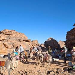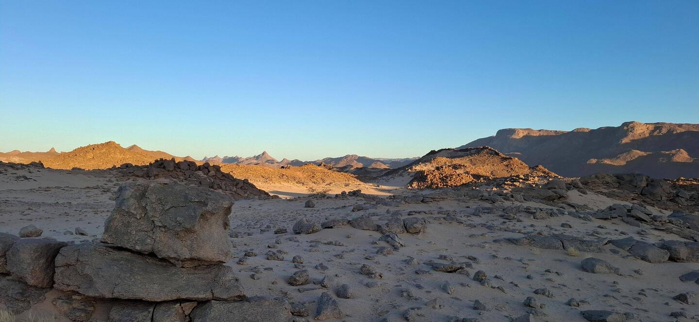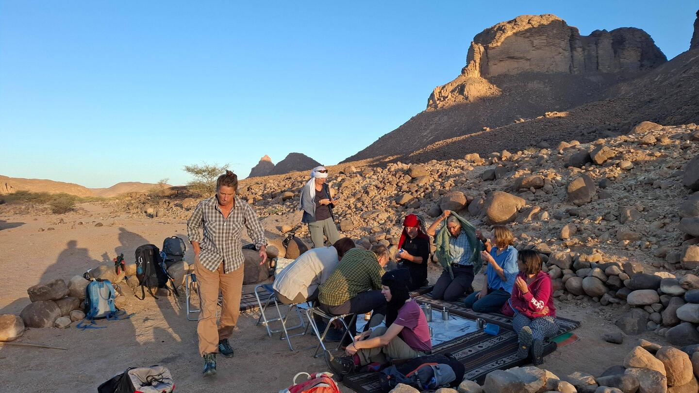 Aufstehen um sechs Uhr, meistens im Schein des Vollmondes, sich einen irgendwie uneinsichtigen Platz für die Frühtoilette suchen, was oft gar nicht so einfach ist, Toilettenpapier verbrennen oder verscharren, zum Himmel schauen, zu den Bergen, die Weite, die Unwirtlichkeit, aber auch Ruhe wahrnehmen, Zelt einpacken, zum Treffpunkt bringen, samt des Gepäcks. Kurzer Tee, La vache qui rit-Käse, Nutella, Maemelade, dann Aufbruch mit den ersten Strahlen der Sonne. Steinwüste und Gesteinswelten aus der Urzeit. Ungefähr fünf Stunden gehen, dann Mittagessen, Salat, Reis oder Nudeln, eine Stunde Pause, dann erneuter Aufbruch. Tagespensum bei 25000 Schritten im Durchschnitt, später im der Woche nurmehr bei 15000. Nach der Rückkehr von der Nachmittagstour gibt es Tee oder Kaffee, Nüsse und ein paar Kekse, Gespräche über das Leben der Tuareg früher, warum Esel weiße Nasen haben, das Leben heute, über Butch, den englischsprachigen Begleiter, der seine Kinder unbedingt studieren lässt, und Baba, den Guide, der sich sicher und präzise in diesem Steinlabyrinth bewegt, natürlich viel Gruppendynamik, man liegt am Boden, es gibt vier Klapphocker. Dunkelheit fällt rasch um sechs Uhr ein, der Vollmond wirft sein helles Licht über die jeweilige Szenerie des Lagerplatzes, im Lauf der zwei Wochen wird er zum Halbmond und sogar Sichelmond, der am Ende erst nach Mitternacht aufgeht.