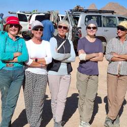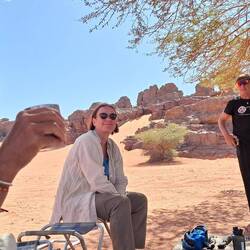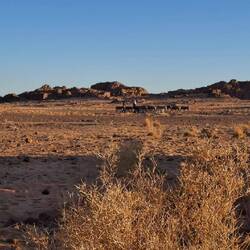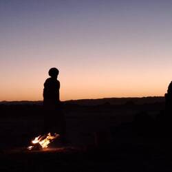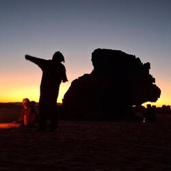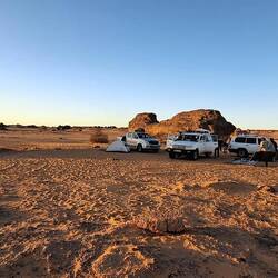 Zum Abschluss ging es zur Gravur der weinenden Kuh, die das Zurückweichen der Vegetation und Beginn der Trockenheit symbolisieren will. In den weiten Sandfeldern immer wieder Solitär Felsformationen, von der einen Seite wie Cäsar ohne Gebiss, von der anderen wie ein Habicht, genauso wechselnd wie das Licht der Sonne. Tee im Abendrot, essen neben Lagerfeuer, Übergabe der Geschenke an die Equipe, Koch, Kochgehilfe und Fahrer. Inzwischen die Sterne über uns und die Nacht um uns. Nur noch zwei Stunden zum Treffpunkt am Flughafen, die meisten dösen, ich schreibe eine kleine Geschichte.Read more