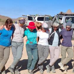 Sonntag. Wanderung durch ein Wüstental. Mein Gesprächspartner ist Uwe, der Sachse, es geht um die Ukraine, die Russen, das Miteinander-reden. In vielem scheinen wir einig zu sein, weniger bei der Migration, auch bei der Einschätzung Putins, auch wenn natürlich von uns beiden für russische Seite und die Geschichte gesehen wird. In Höhlen auch hier Felszeichnungen und Gemälde in den Fels geritzt, immer an wunderbaren Aussichts- oder Übersichtspunkten, heute mit Blick auf Sanddünen und Felsen, damals wahrscheinlich auf Wiesen und Weiden, auf Giraffen und Kuhhherden.