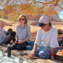 Eine Hochebene mit unglaublichen Felsformationen. Nach einer Wanderung mit 600 Höhenmetern, also für Vincent in einer Stunde zu bewältigen, für mich in drei, für die Gruppe in vier, erreicht man das dritte Plateau in 1700 Metern, eine Mondlandschaft. Steine, Geröll, manchmal eine kleine Erhebung. Der meist sandige Weg führt durch dunkle Steine. Nach und nach aber wachsen aus der Ebene Felsformationen, bis man Tamarit erreicht, eine Landschaft, mit der man eine Zeitreise durch die Erdgeschichte unternimmt. Einstmals Gletscher, dann Meer, dann vom Flüssen durchzogen, dann versteckt, jetzt trocken. Wir sehen noch einen Steinbock, am Boden aber die Zeichnung eines Elephanten, später einer Qualle. Wie sieht unsere Welt in 8000 Jahren aus, dort, wo wir noch an Flüssen sitzen, oder wo wir am Strand ins Meer gehen. Die Felsen regen unsere Phantasie an, wir sehen Köpfe, Dromedare, Zinnen, den Schrei von Munch, Arkaden, Ungeheuer. Unsere Beine sind müde, 20 Kilometer sind bewältigt, da noch ein tiefer, steilst abfallenden Canyon, da noch eine Wasserstelle, da ein Tal voller 2000 Jahre alter Zypressen,in der die Esel ihr Futter suchen. 14 gibt es noch, zwei davon sind leider auch schon verdörrt, abgestorben. Müde erreichen wir unseren Nachtplatz. Die Sonne geht unter, der Vollmond besteht über der einmaligen Landschaft der sich in den Nachthimmel reckenden Zinnen, Köpfe, Obstschalen auf Berggraten. Es gibt warmen Ingwertee. Wir liegen auf drei Teppichdecken um den gedeckten Bodentisch, weit weg von daheim.Read more